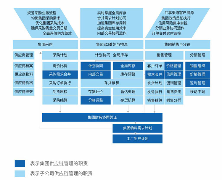 供應鏈管理戰略包含:意向訂單管理、詢期單復期、虧損訂單管理、訂單下達、訂單排產、半自動排產、供應商送貨計劃、訂單齊套分析、缺料預警分析、生產資源限制、生產達成分析、缺料異常分析、物料員與供應商績效評價、庫存管理。