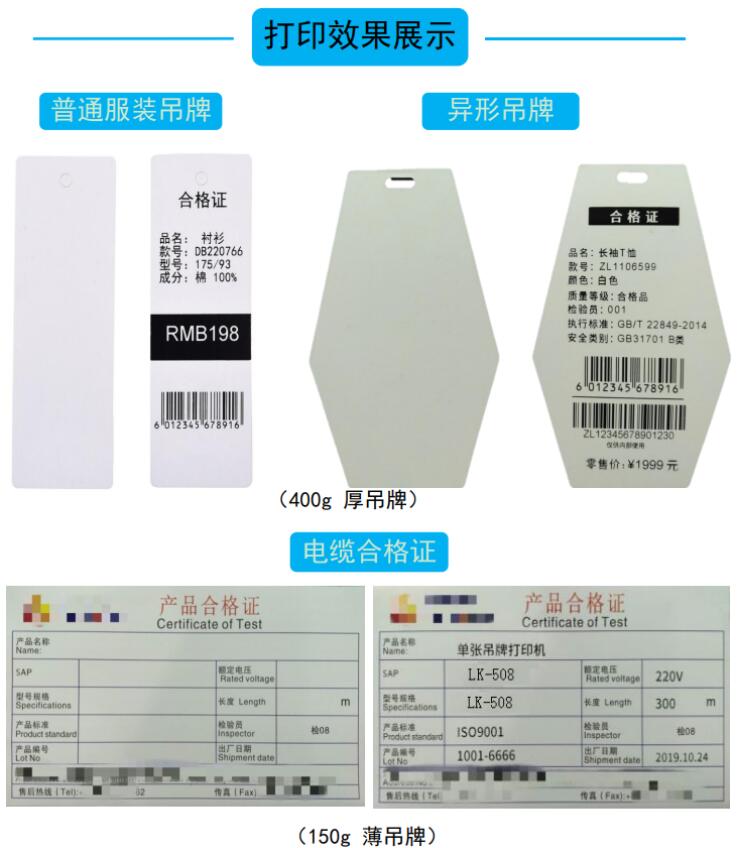 單張服裝吊牌打印機是專業用于一張張打印單張服裝吊牌,或單張產品合格證吊牌的打印機。它廣泛使用于服裝吊牌、鞋帽產品合格證吊牌。